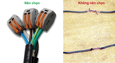 Khi kết nối hai dây dẫn với nhau, tốt nhất nên sử dụng các đầu nối dây điện thích hợp hoặc hàn dây của bạn với nhau và dùng co nhiệt để bảo vệ. Để các vết nối dây trần làm cho việc lắp đặt của bạn có nguy cơ gây ra chập cháy và hỏa hoạn. Luôn luôn sử dụng các đầu nối dây thích hợp và không bao giờ để lại vết nối dây trần.