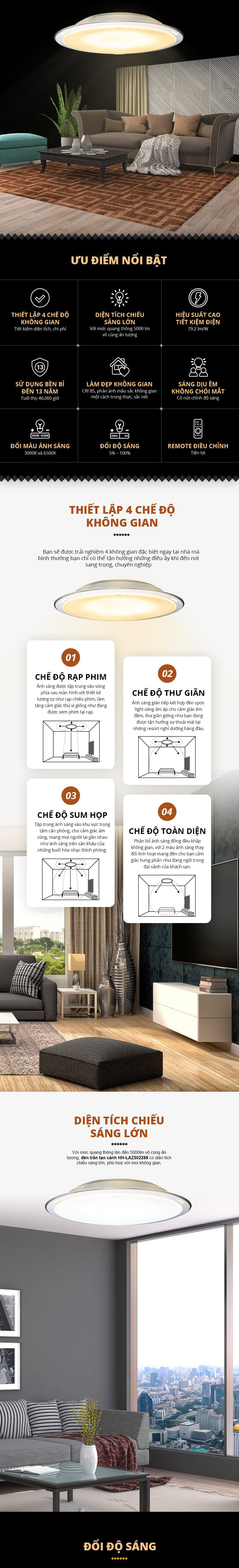 - Đèn trần tạo cảnh HH-LAZ502288 có mức điều chỉnh ánh sáng từ 5% - 100%, linh hoạt phù hợp với từng thời điểm và mục đích sử dụng khác nhau như không gian phòng khách hay phòng ngủ. Dù điều chỉnh ở mức độ nào thì đèn vẫn mang lại nguồn ánh sáng êm dịu, dễ chịu cho người dùng.