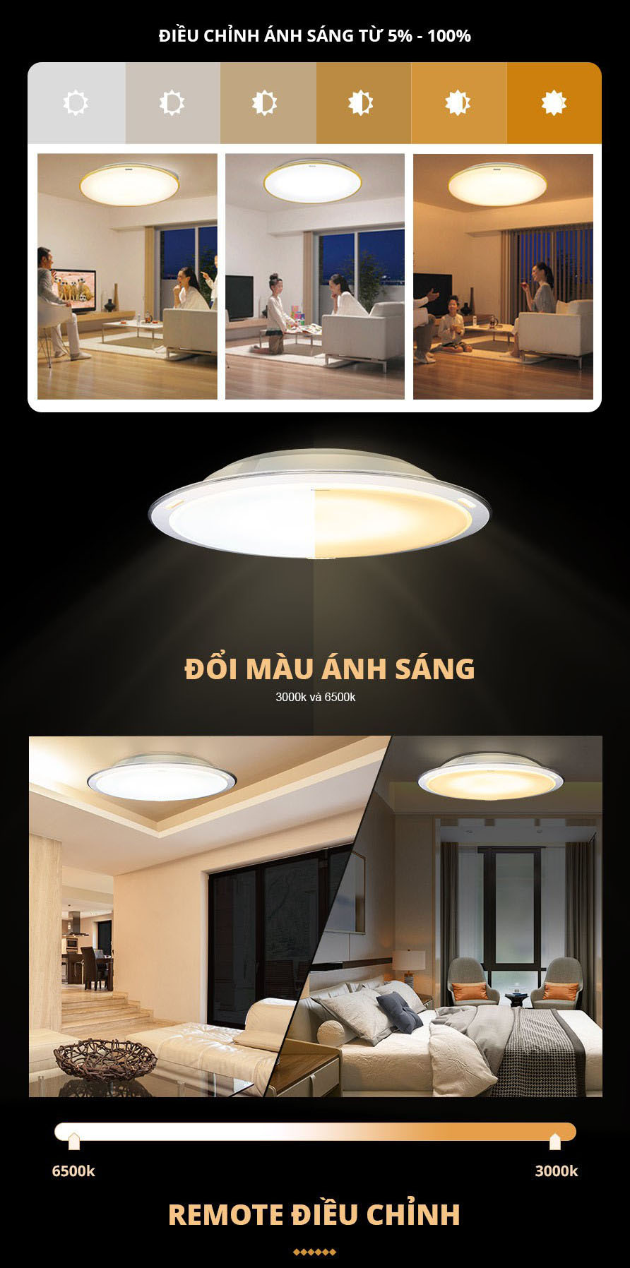 - Sử dụng remote điều chỉnh độ sáng (100%-5%), đổi màu ánh sáng trắng 6500K, vàng 3000K
