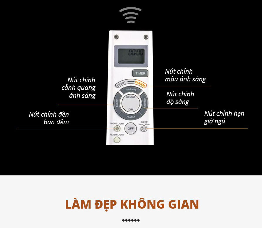 - Đèn được thiết kế cùng với điều khiển từ xa cao cấp. Bạn có thể dễ dàng điều chỉnh 4 chế độ sáng, độ sáng hay chuyển đèn trắng sang đèn vàng… chỉ bằng thao tác đơn giản trên chiếu điều khiển. Điều khiển được thiết kế đầy đủ tính năng nhưng rất đơn giản để mọi người trong gia đình đều có thể sử dụng.