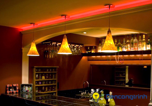 Đèn tam giác hình dáng bông hoa huệ, sử dụng đèn led chiếu sáng. Màu vàng từ chụp đèn và dây đèn led chạy ngang qua khu quầy bar khiến ánh sáng có thể soi sáng một vùng rộng. Kèm theo là đèn trang trí tủ rượu và khu đựng ly khiến khung cảnh trở nên thật nổi bật.