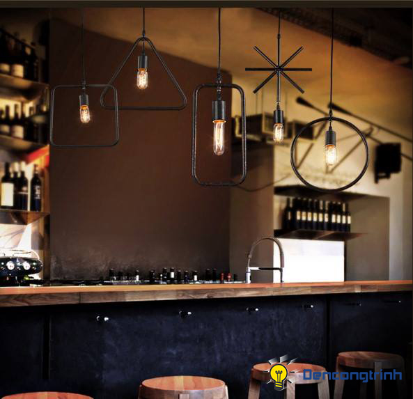 Khung đèn dùng các hình vuông, tam giác, chữ nhật hay hình sao để thiết kế. Bóng đèn dùng loại bóng Edison với nhiều hình dạng và kích thước khác nhau. Thiết kế này phù hợp với nhiều quán tại Việt Nam.