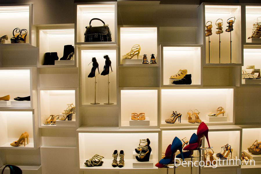 Với những sản phẩm khác nhau, thiết kế showroom phân chia không gian và bố trí đèn led sáng rực rỡ. Mẫu showroom giày dép này mang tới trải nghiệm đẳng cấp và ấn tượng khó phai với khách hàng.